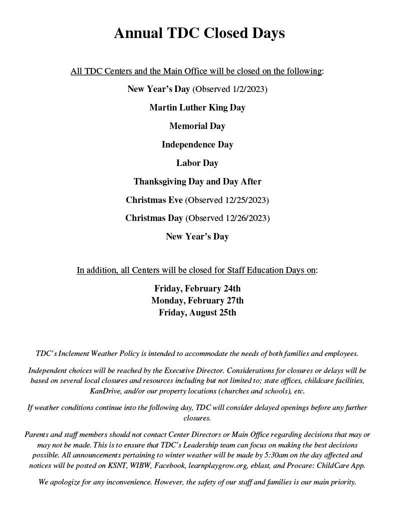 Parents and staff members should not contact Center Directors or Main Office regarding decisions that may or may not be made. This is to ensure that TDC’s Leadership team can focus on making the best decisions possible. All announcements pertaining to winter weather will be made by 5:30am on the day affected and notices will be posted on KSNT, WIBW, Facebook, learnplaygrow.org, eblast, and Procare: ChildCare App.